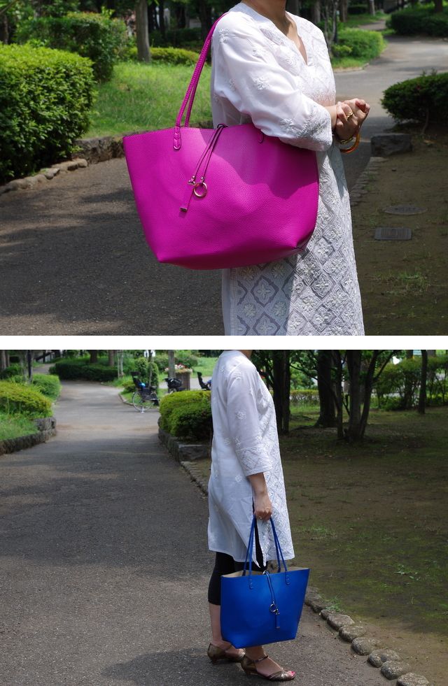 (ダブルフェイス)リバーシブルのバッグの色は、全部で9色。ピンクやブルーのビビッドや目をひく色の反対は