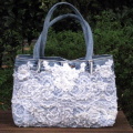 ユーズドデニムに上品なレースをいっぱいに使用して作られたリメイクデニムの手作りバッグ。