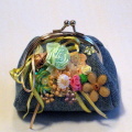 ユーズドデニムに色とりどりのフラワー、リボン、ビーズがいっぱいついたがま口型財布。お財布としてではなく、物がたくさん入るのでマルチポーチとして使えます。