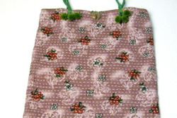 持ち手には、ポンポンのついた芯の入った手縫いにの紐が3本使われた非常にかわいい手づくりバッグです。