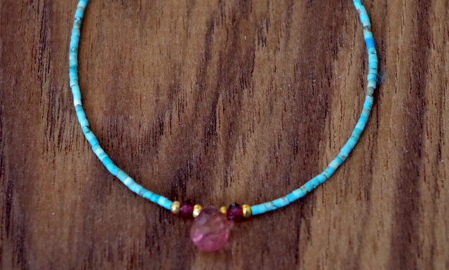 ブレスレット部分は、けし粒のように細かいターコイズビーズ。初めてのジュエリーにふさわしい