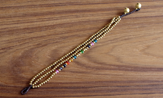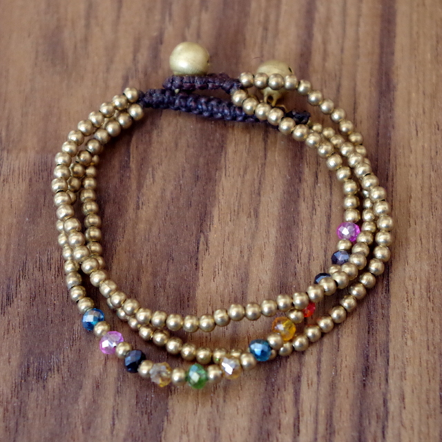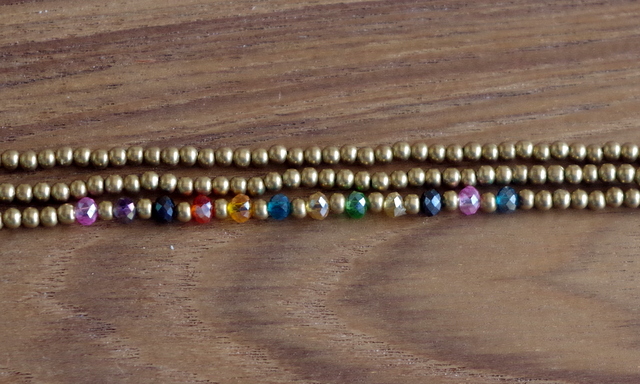 3連のゴールドビーズブレスレット。いぶしたようなマットゴールドのビーズが2本、カラフルなガラスビーズが