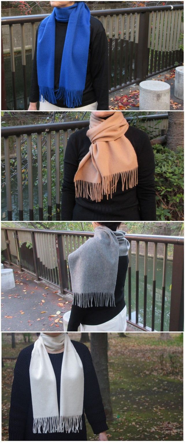 なめらかな毛100%です。しっかりとした厚みがあって、これ1枚を巻くだけで十分な暖かさです。