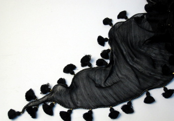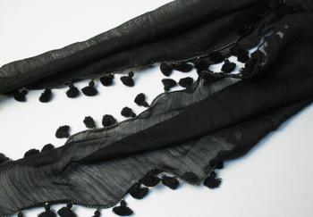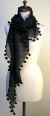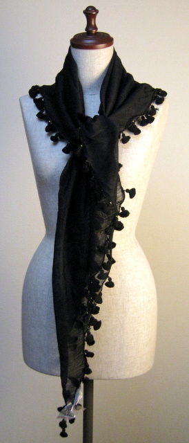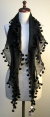 ひし形のストールに、びっしりと同色のポンポンがついています。
