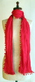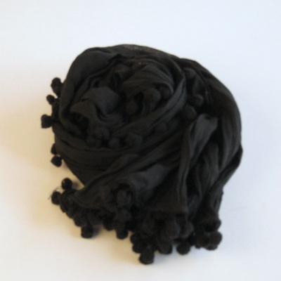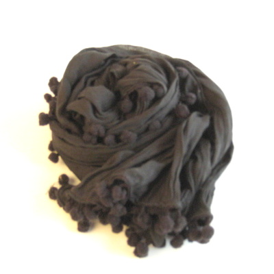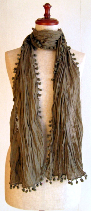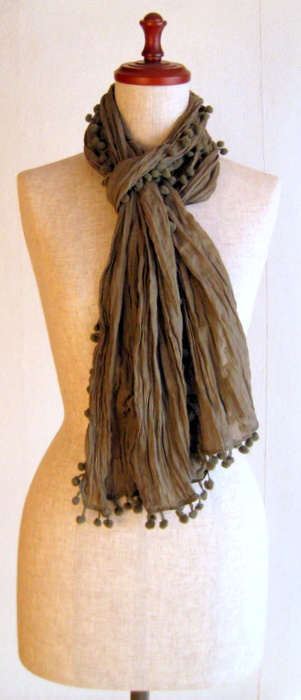 かわいいポンポンがぐるりとついて、シャーリング(シワ加工)されているために手軽に持ち運べる綿ストールです。