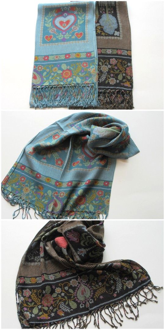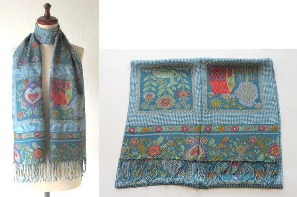 25年の秋冬の新柄ストール、ビスコース100%のクロスステッチ模様の花・植物柄・ハート柄ストール。