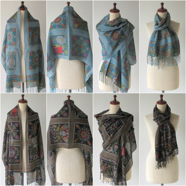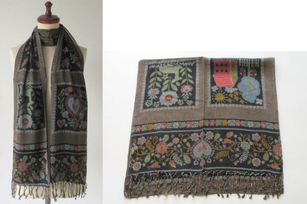 刺しゅう模様のストールは、ベース色が暗いですが、渋めの服にコーディネイトすると、華やぎます!