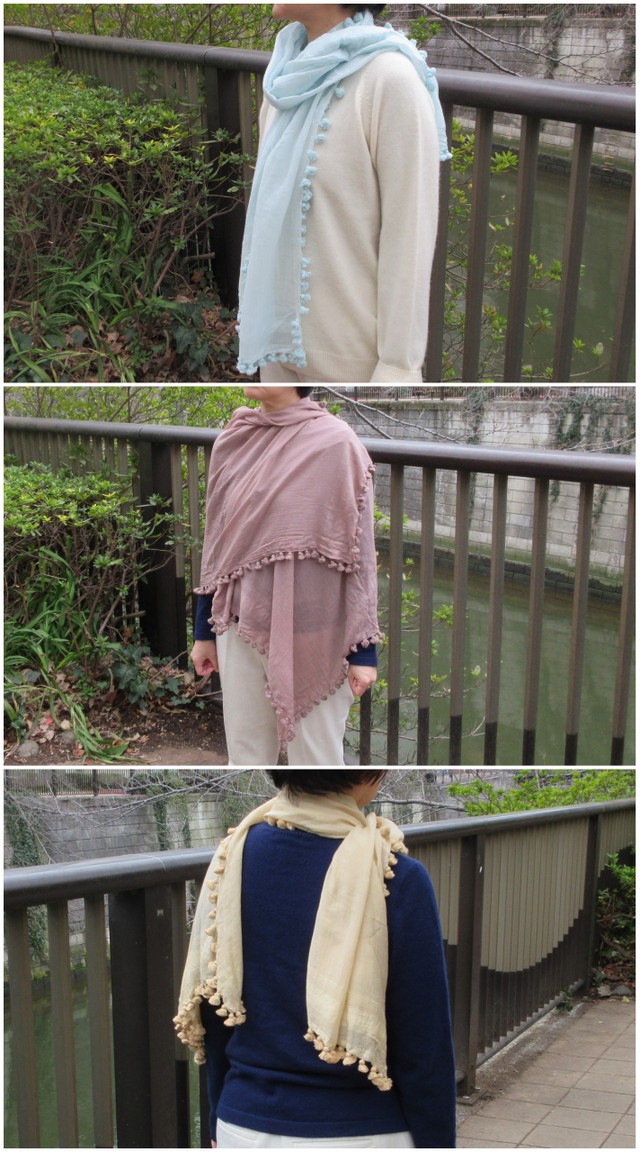 ポンポン ストール 大判 Chunni 無地12カラー コットン シルク スカーフ レディース 春夏 春物 夏用 秋 <CITRUS Mattaで人気のタッセル> 大判ストール★メール便対応
