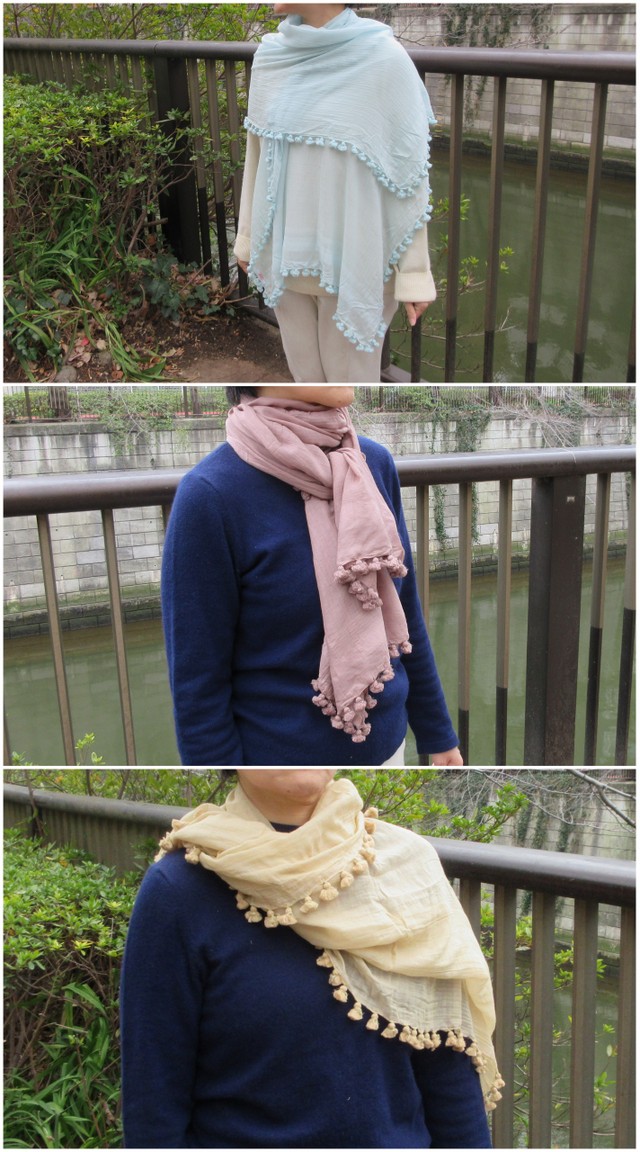 イエローとブラック購入。薄手ですがかなりの大判。肌触りもよく品がいい感じ。ポンポンが小ぶりなのがいい。全色買いしたい。