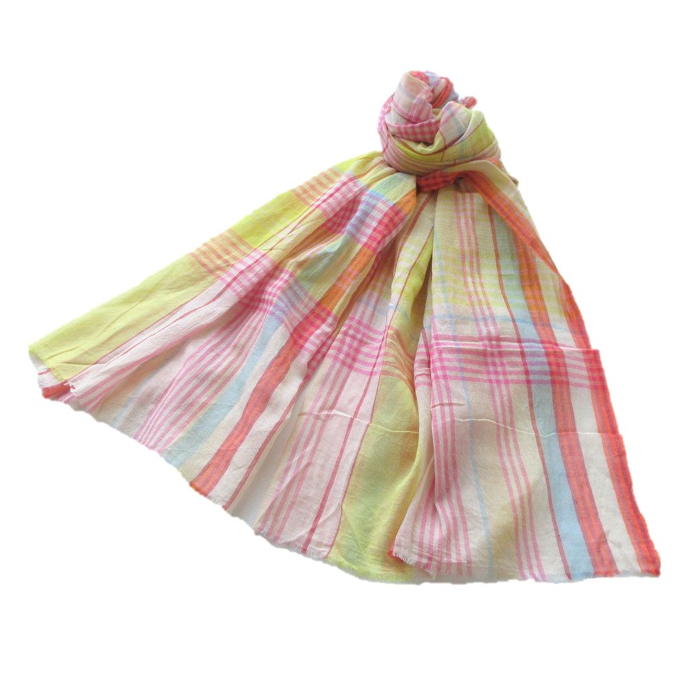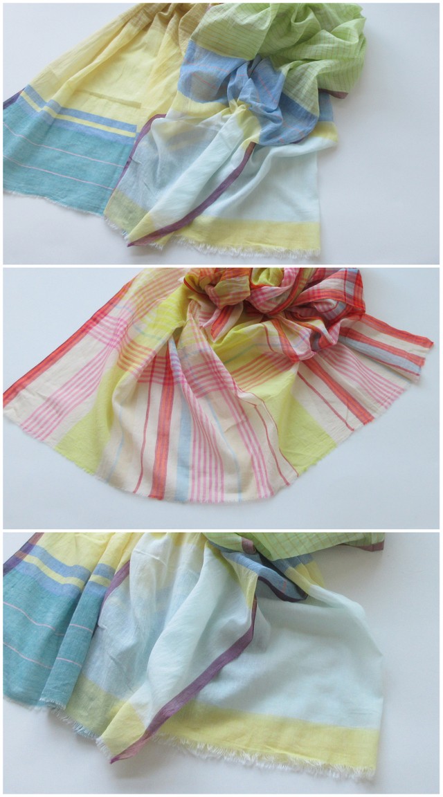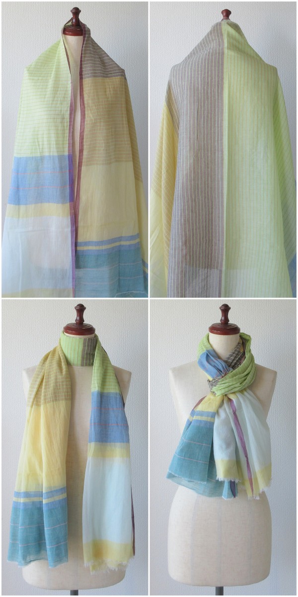 コットンのストライプ(ボーダー)の大判ストールは、巻くだけでおしゃれに見えます。