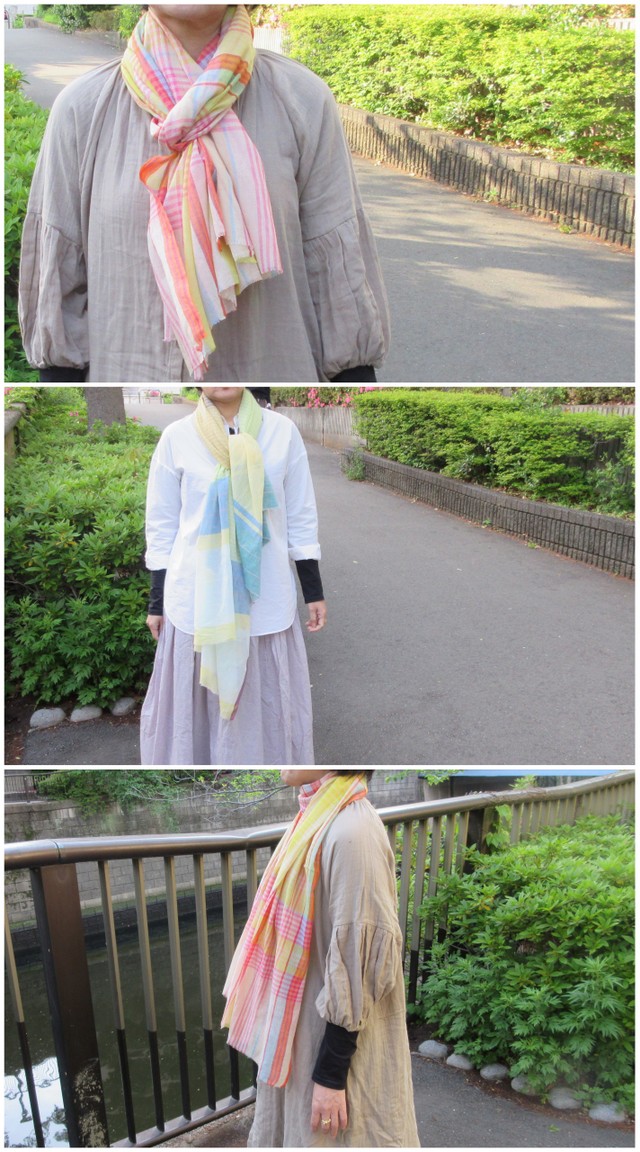 春から夏にかけて、紫外線が気になる中、首にまいてのUVカットにはコットンストールは欠かせません。
