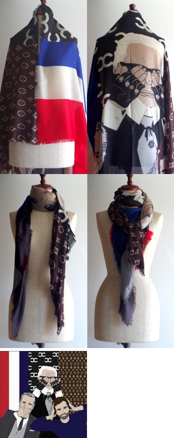 ファッション業界の3人の賢人が描かれています。スクェアタイプは半分に折ってさらりとかけるもよし