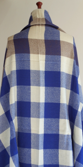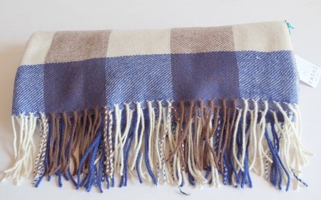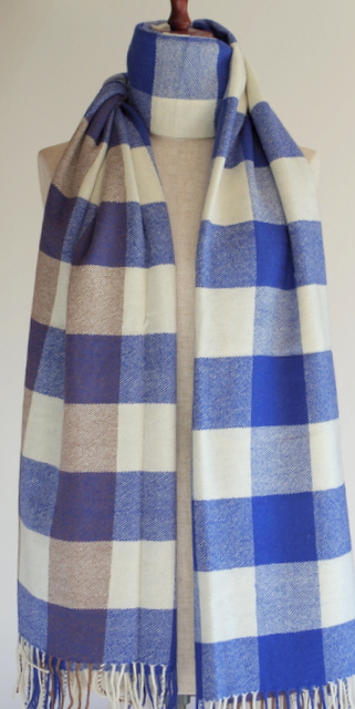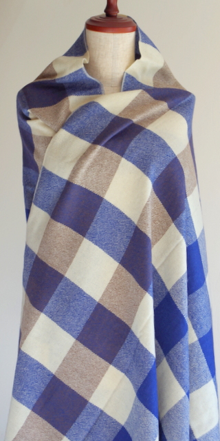 大トレンドのチェックの大判・厚手ストールです。ナチュラルホワイト・ブルー・ブラウンの約8センチのチェック