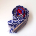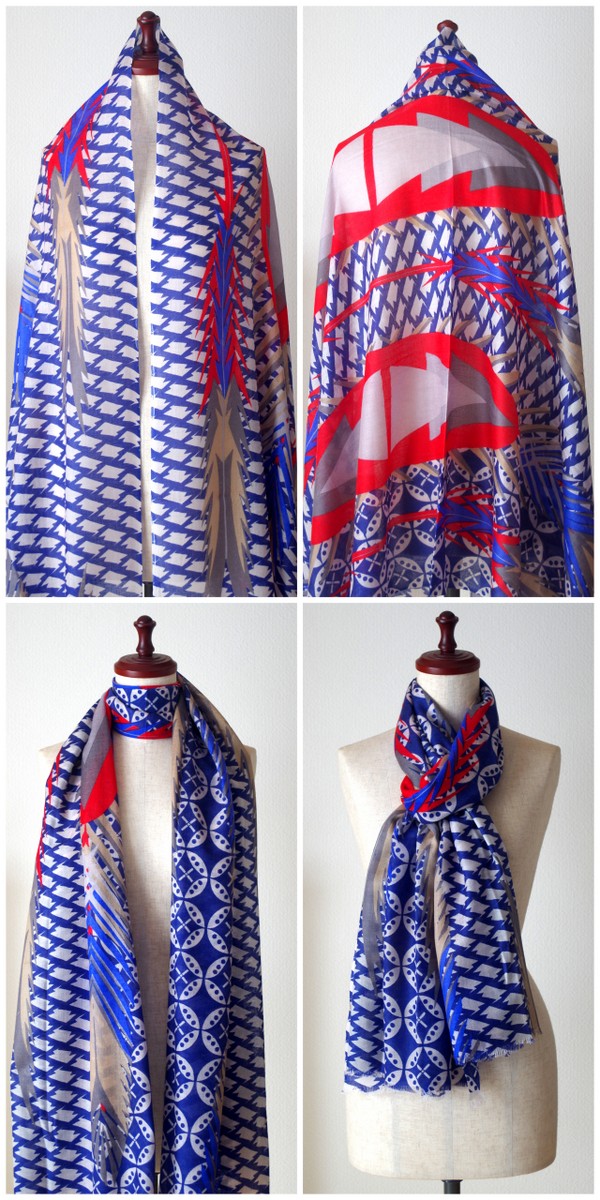 描かれた幾何学模様がいっぱいのYARNZらしい柄物の大判ストール。