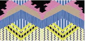 ストライプ、三角、ひし形の大小様々の幾何学模様がいっぱいに描かれています。まるで、迷路のようです。