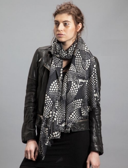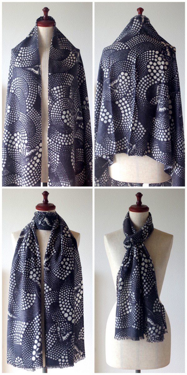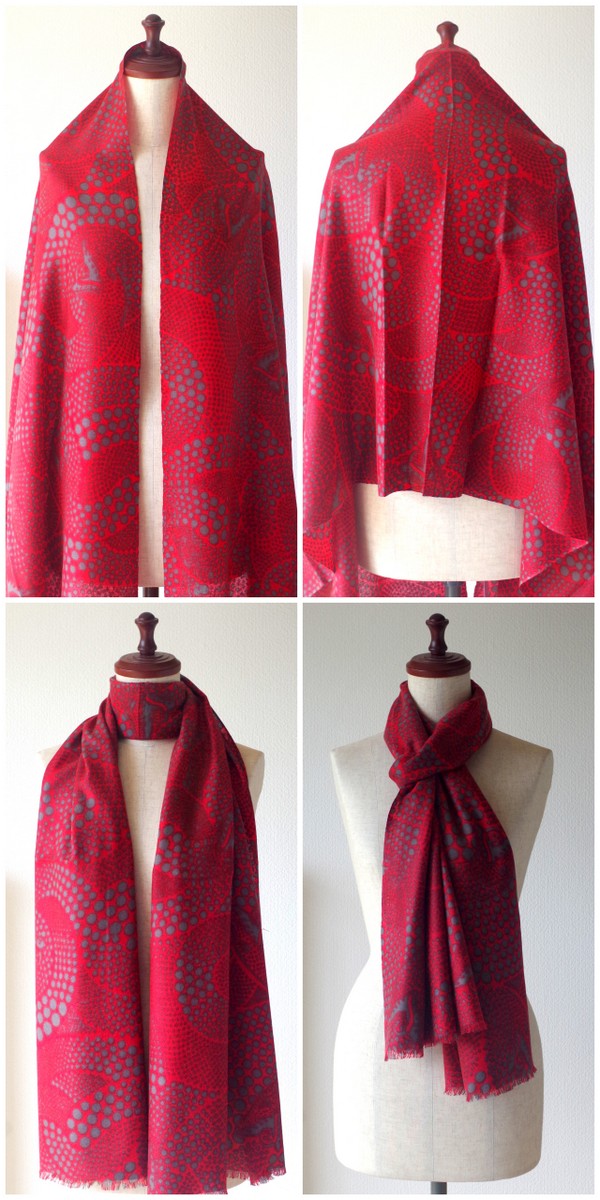 ストール一面に描かれると、植物というよりドット柄の幾何学模様です。色は2色で、赤と黒。