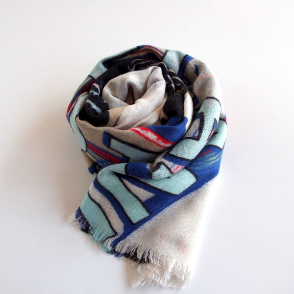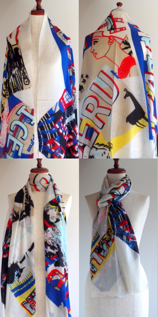 プリントのストールがいっぱい。思わず、ストールを巻いて旅に出たくなるそんな気分になります!