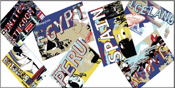 世界各国のポスト―カードが散りばめられています。それぞれの国の名所が描かれています。
