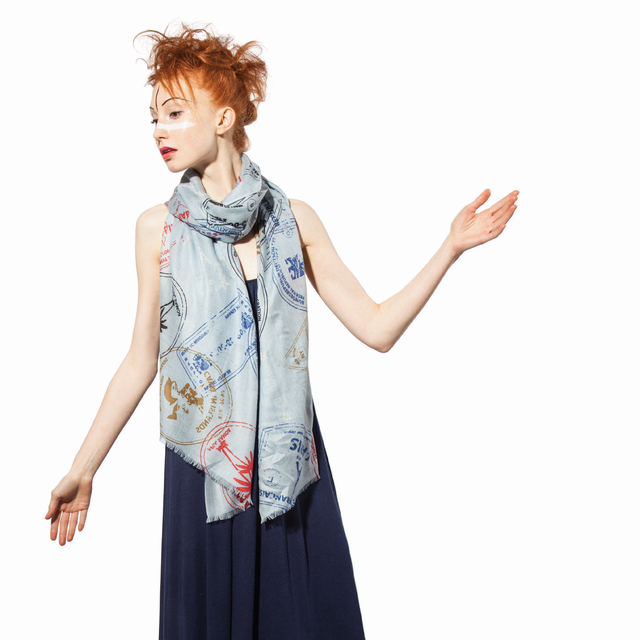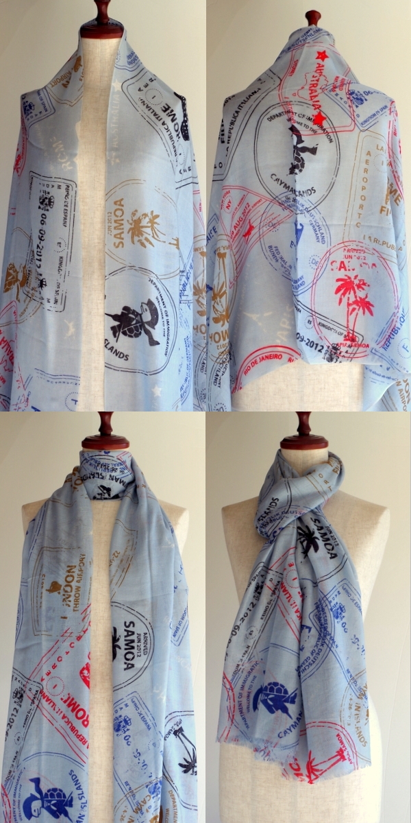 ストールいっぱいに、パスポートの中の各国のスタンプです。入国の際のスタンプは各国で特徴があり