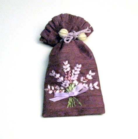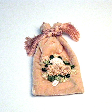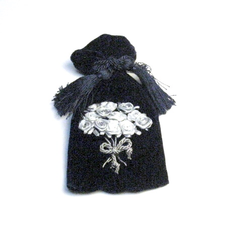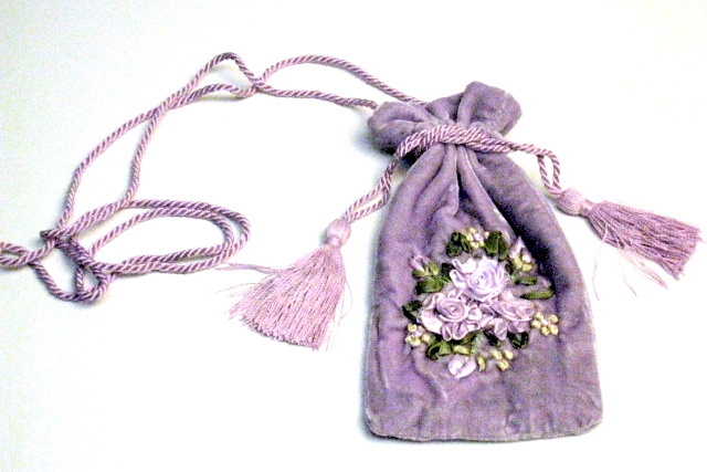 こちらのめがねケースは、別珍にリボンテープを使ってバラやラベンダーを刺しゅうされたハンドメイド。