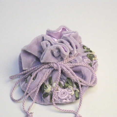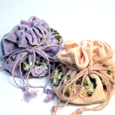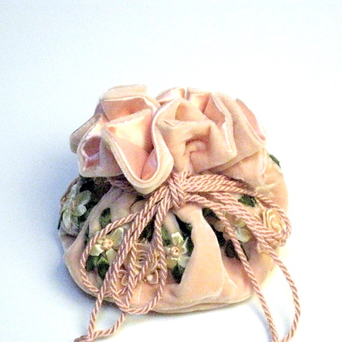 こちらのジュエリーケースは、別珍にリボンテープを使ってバラのモチーフを刺しゅうされたハンドメイド。