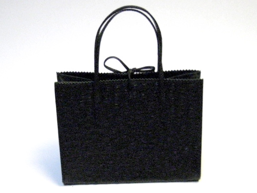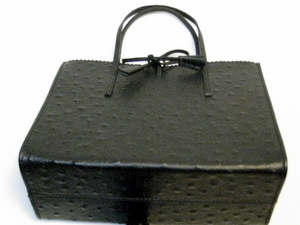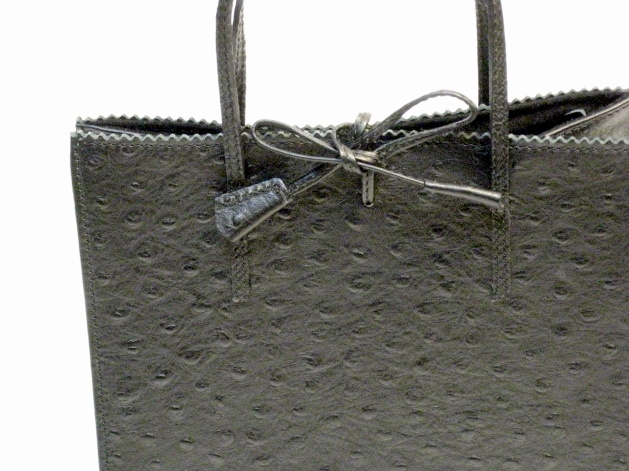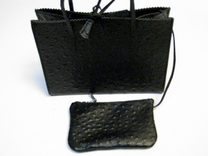 オーストリッチのブラック素材を使ってのシンプルなデザインのミニトート。開口部は、紐をリボン状に
