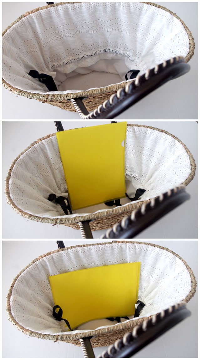 カゴバッグのカジュアルさがありながら、なんと中身が見えないように巾着型の内布付です。