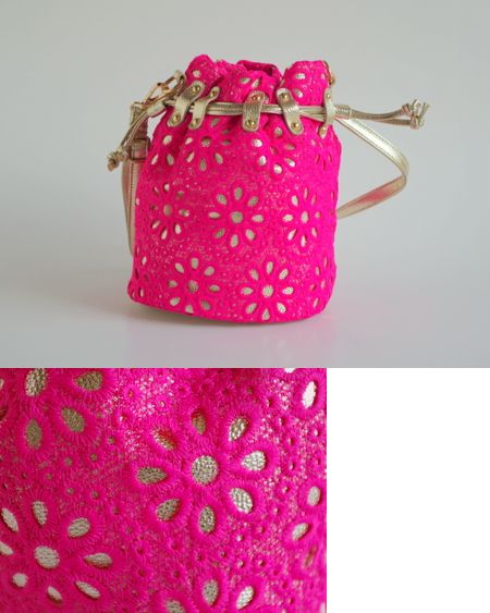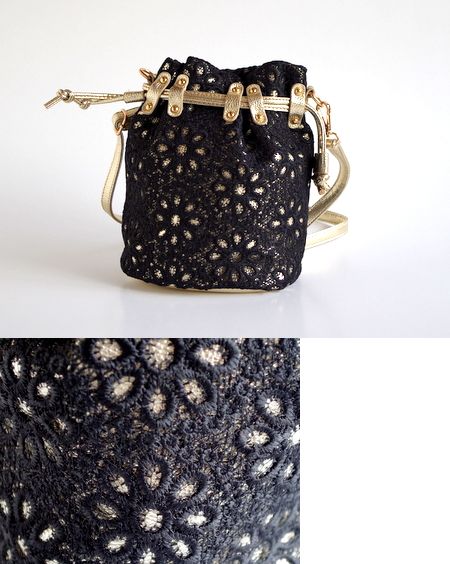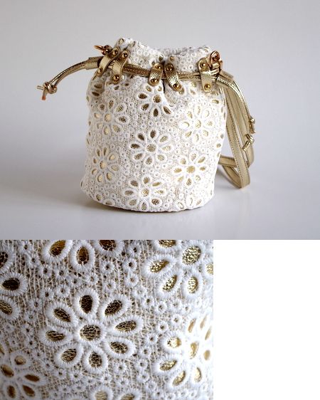 斜めがけのできるポシェット。ゴールドのフェイクレザーにフラワーのレースをかぶせたかわいいバッグ。