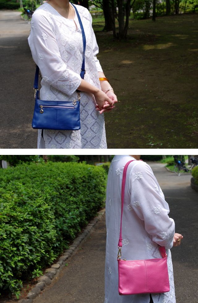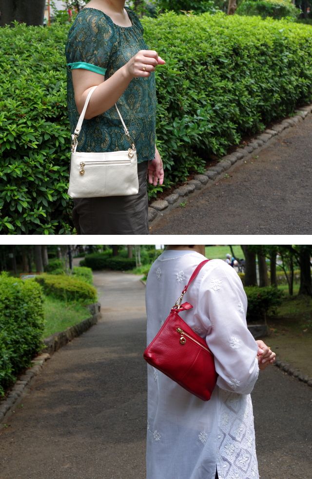 斜めがけバッグの色は全部で5色。定番のオフホワイト・ブラックにレッド・ピンク・ブルーのはっきりした色。