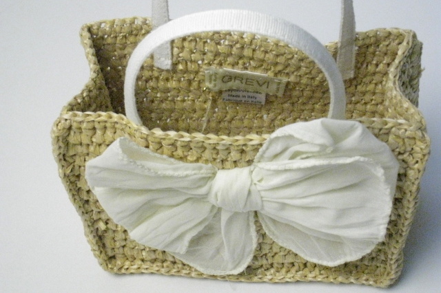 大きな白いリボンが小さなストローでできたカゴについた、かわいらしさ満点のGREVIのカゴバッグ。