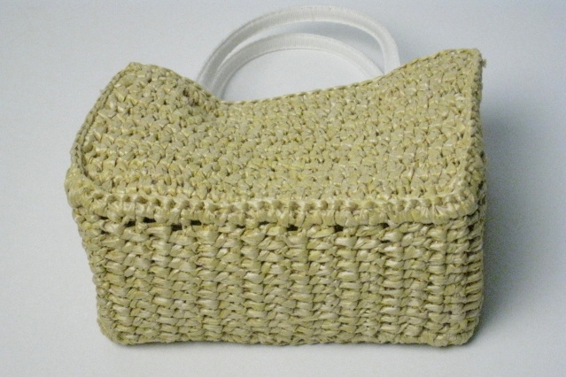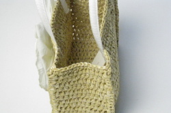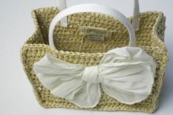 ミニミニのストローバッグに大きなホワイトのリボンがついたGREVIのカゴバッグ。