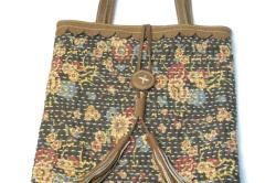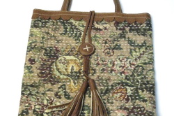 アクセントになる革素材でできたタッセルとボタンで、バッグの開け閉めができるようになった手作りのバッグです。