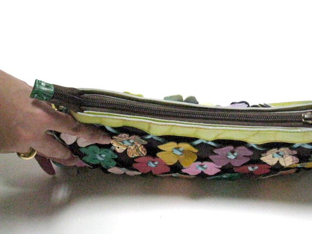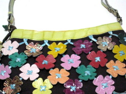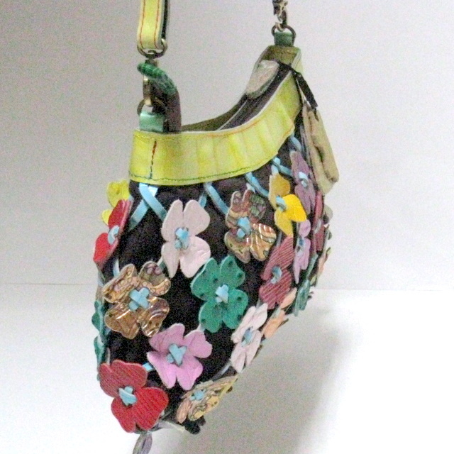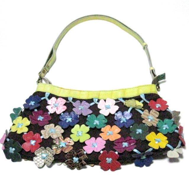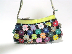 レザーの色とりどりのお花がたくさんついた、かわいいハンドメイドバッグ。