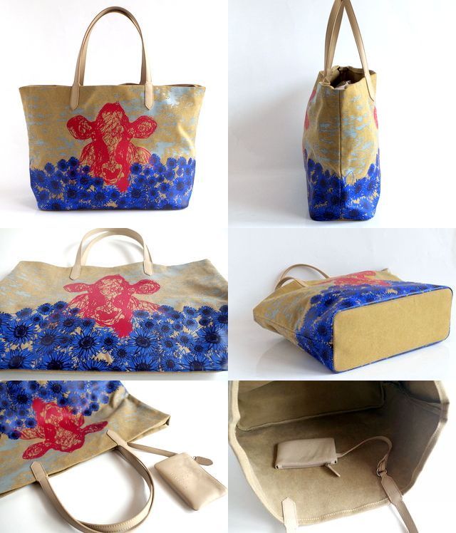 色は、キャメル地にブルーの花いっぱいとレッドのウシモチーフのコンビ