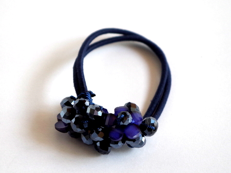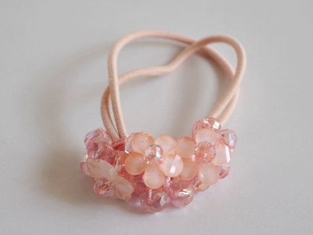 何個ものガラスビーズでつくられたビーズのヘアゴム。中央に3つの花があってとってもかわいいです。