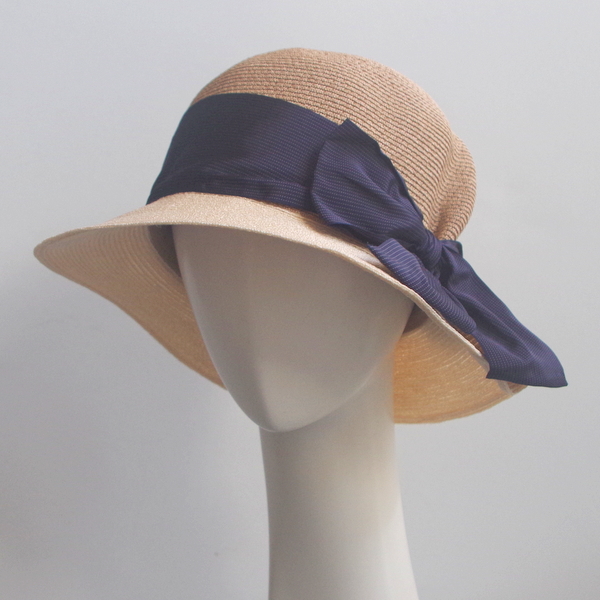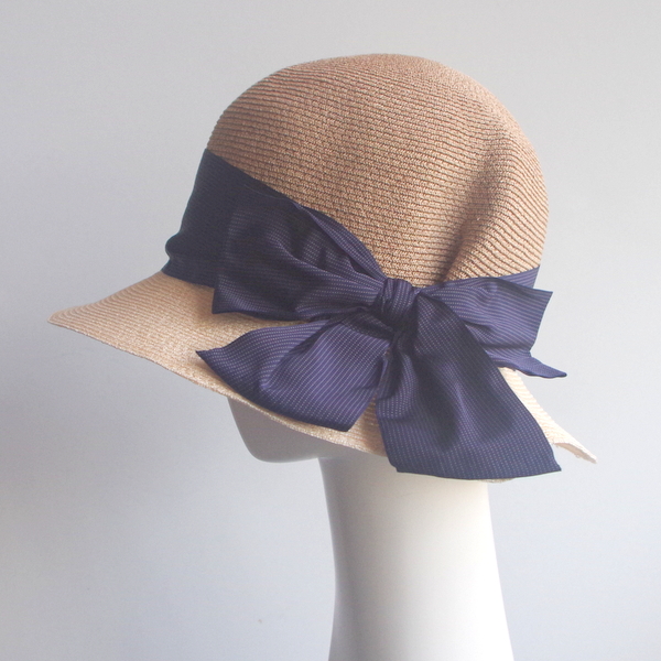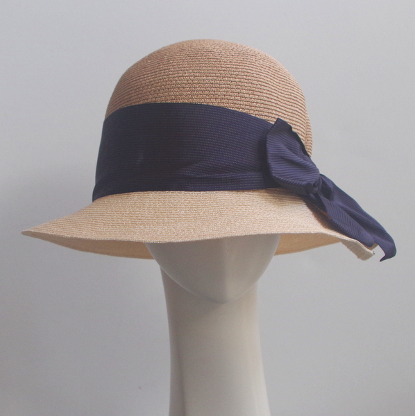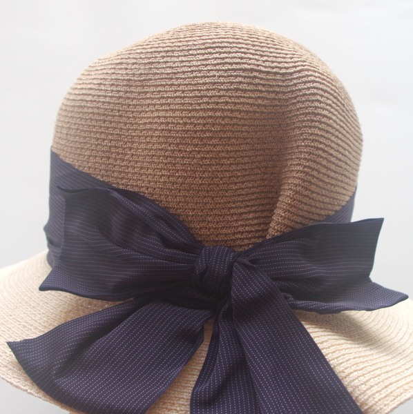 いわゆるまるてんといわれるプレーンなモデル、アバカもナチュラルとブラウンの2色使いのコンビ。 リボンは太めですが、メンズでも使用する少しマニッシュなストライプ柄。 甘くなり過ぎず、大人が被って素敵なのは、さすが、イタリアのデザインならではです。