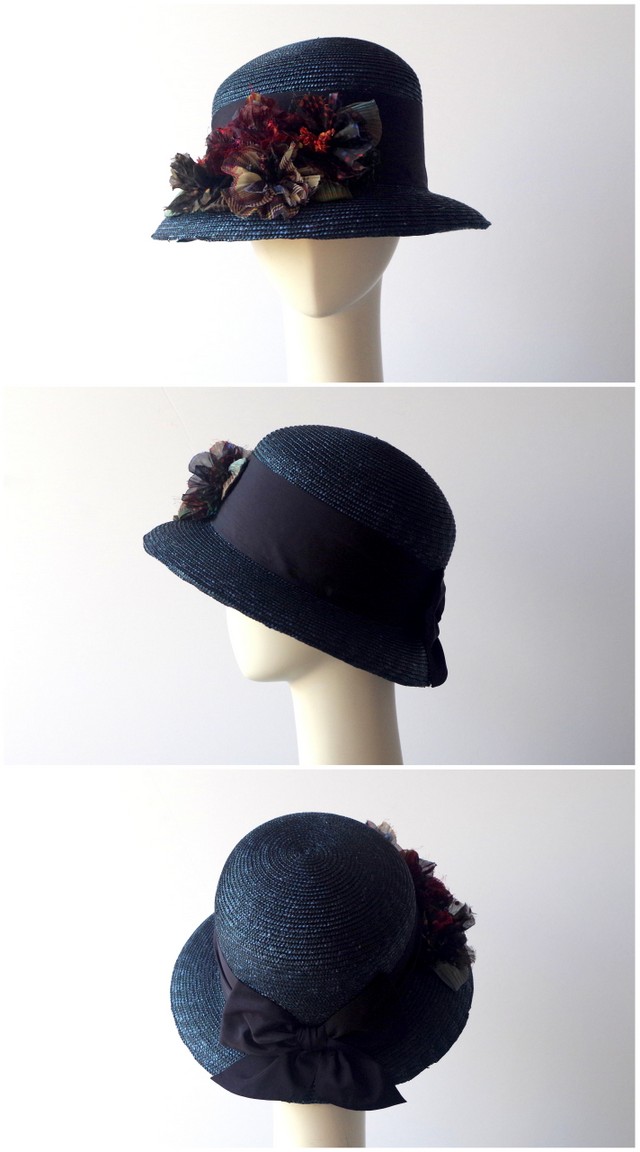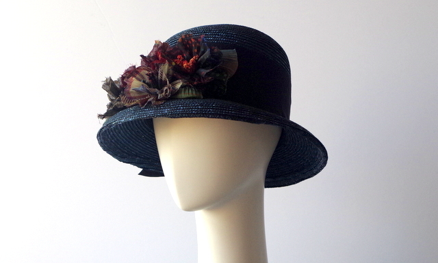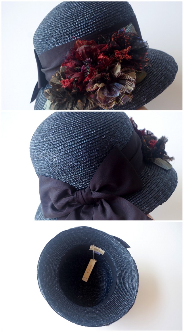 麦わらの色が、まさしく大人が被るのにふさわしい紺色で、コサージュの色は