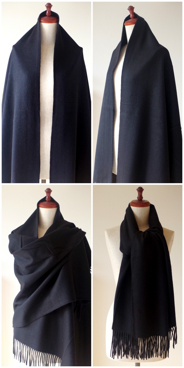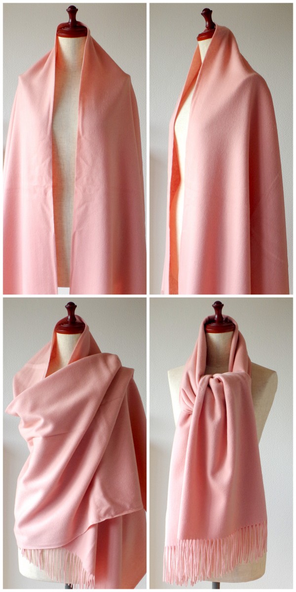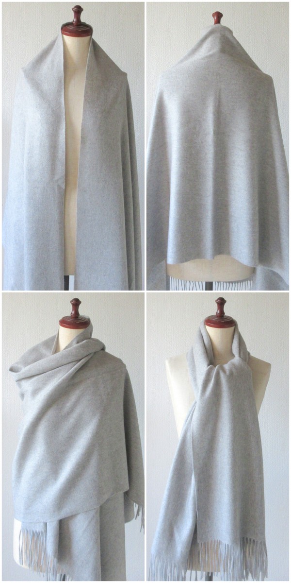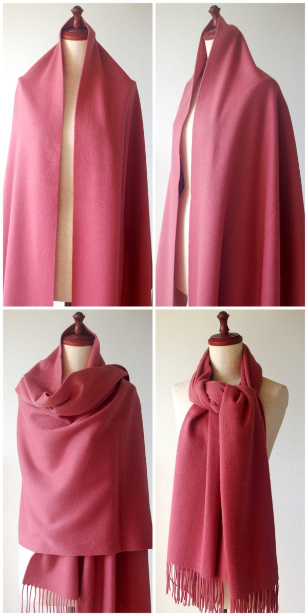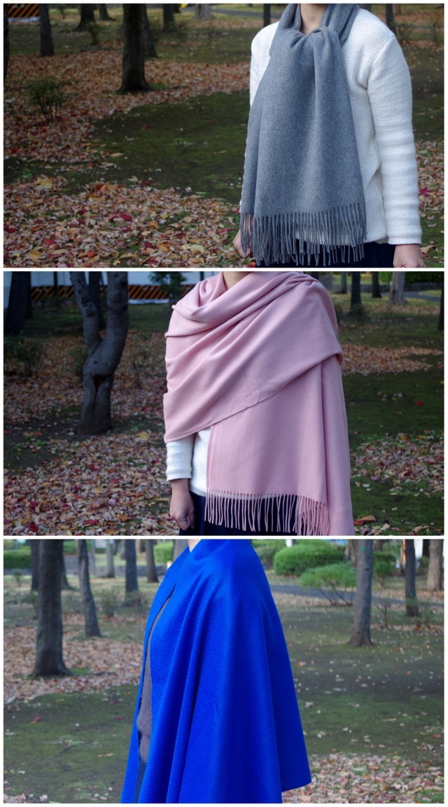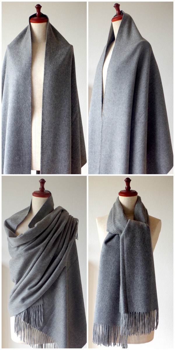しっかりとした重さがあってこれ1枚を巻くだけで十分なあたたかさです。厚手でしっとりとしていて、とっても柔らかな肌触りで、カシミアストールです!