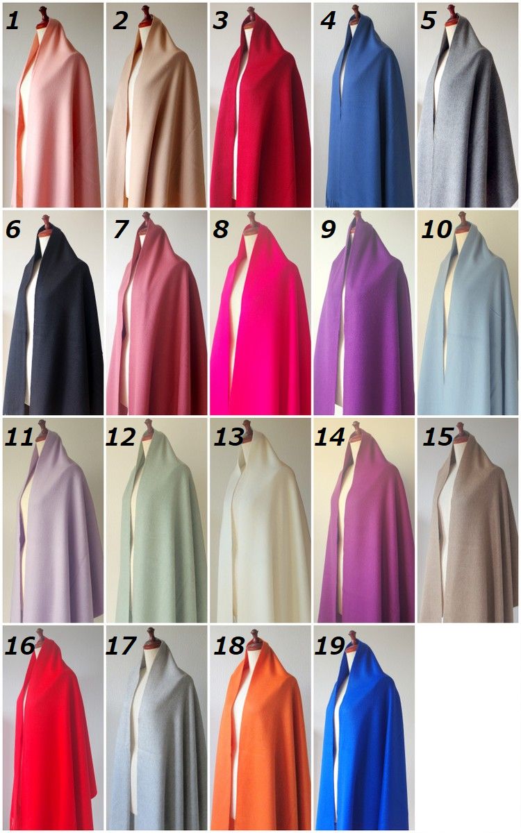 色は、上品で顔うつりが抜群なピンク、キャメルに近いベージュ、あたたかい深みのあるワイン身に着けていれば必ず目を引くロイヤルブルー、シルバーとチャコールの間のグレー、定番のブラックレッドブラウン(あずき色)、目の覚めるようなフューシア、パープルの9色です。