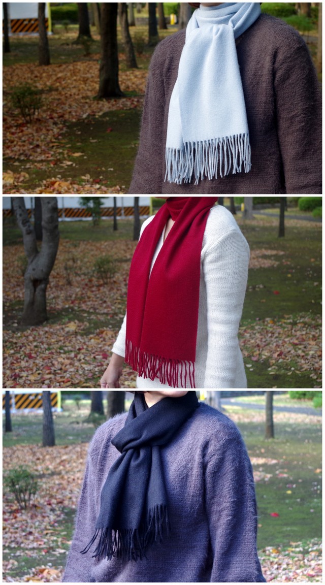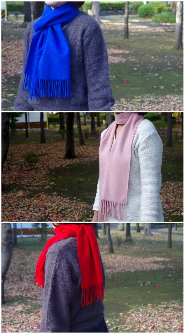 カシミヤ100%の無地のマフラー。寒い冬には最適なあたたかい厚手の無地ストールです。中国・内モンゴルでつくられた高品質の優しい肌触りのマフラーです。カシミアならではのソフトで なめらかな肌触り。しっかりとした厚みがあって、これ1枚を巻くだけで十分な暖かさです。