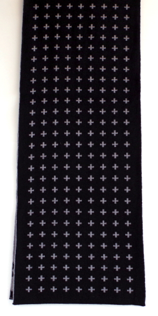 によってアレンジされたユニークなメリノウールマフラー。よく見ると非常にユニークなモチーフが。<br>