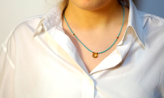 ネックレス部分は、小さなターコイズ。1ミリ程の繊細なターコイズビーズです。