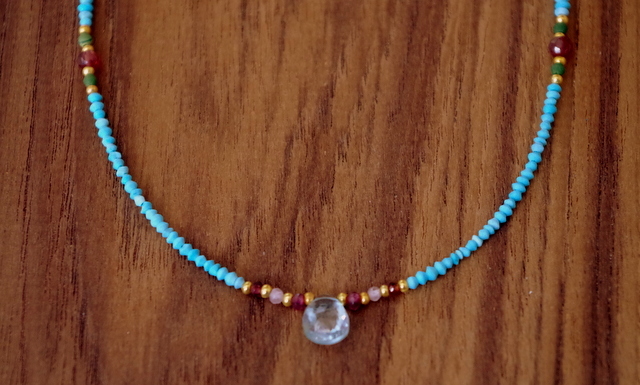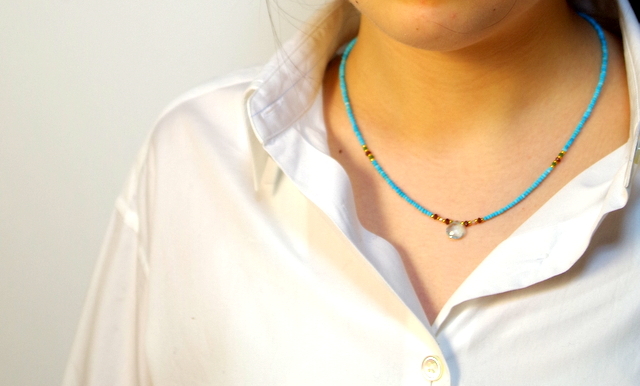 ネックレス部分は、小さなターコイズ色のシードビーズ。1ミリ程の繊細なビーズです。