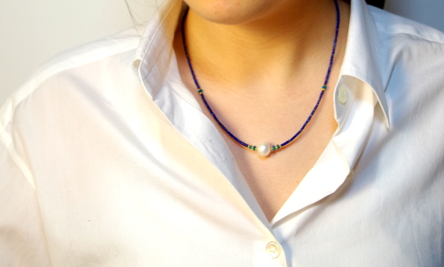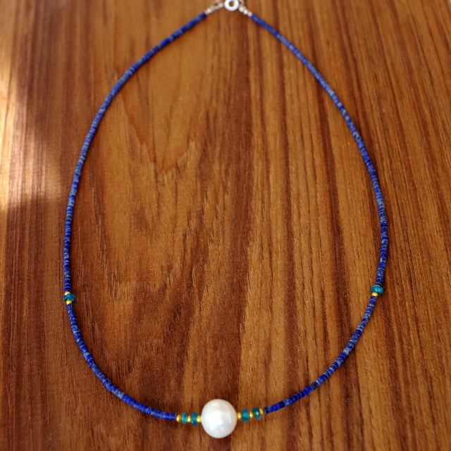 ネックレス部分は、ラピズラリ。和名を『瑠璃』と呼び、紀元前から世界各地で『幸運を招く石』と崇められてきました。