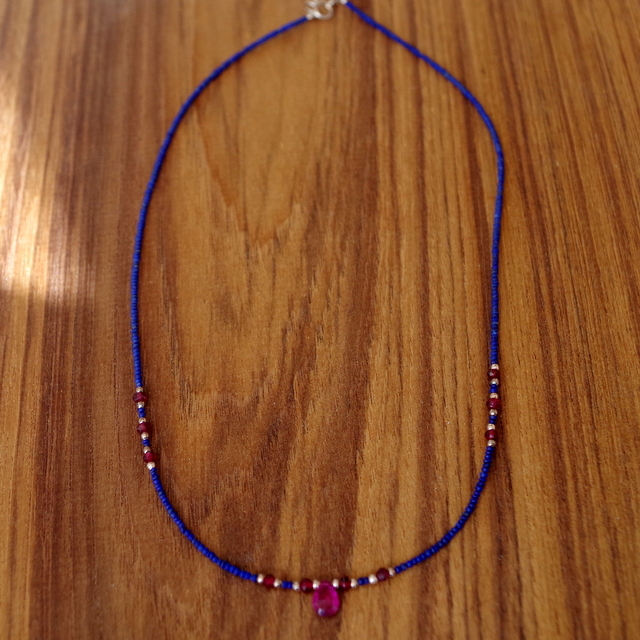 ルビーとネイビーのケシのような小さなラピスのビーズとシルバービーズがファッショナブルです。