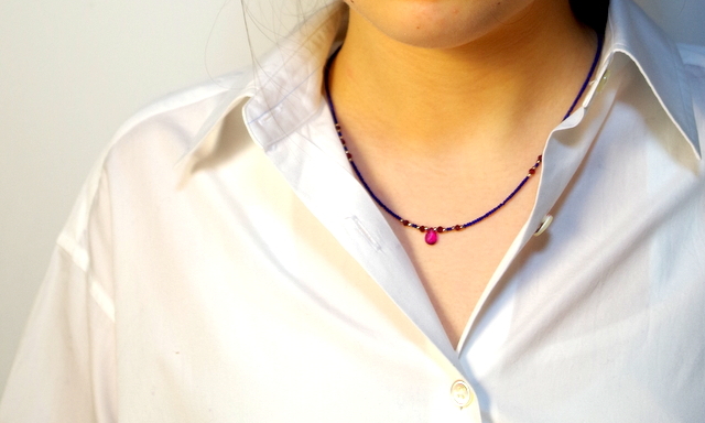 濃いピンクのルビー、しずく型(ドロップ型)のルビーがついたネックレス。