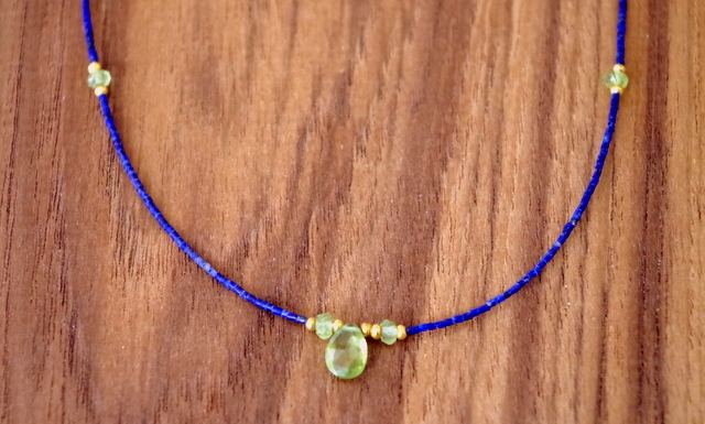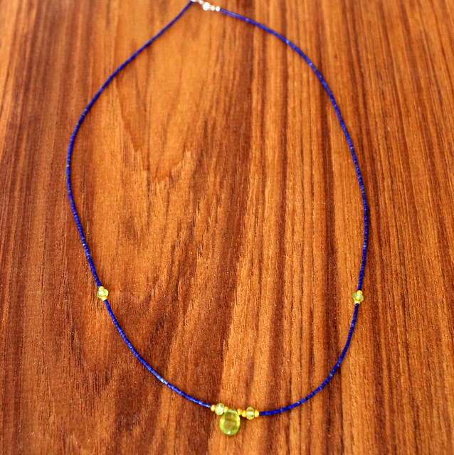 ペリドットとネイビーの細かい、小さいラピスのビーズとシルバービーズがファッショナブルです。