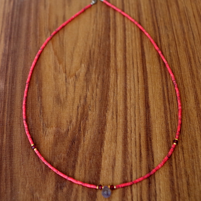 ネックレス部分は、コーラルのビーズ。和名を『サンゴ』と呼び、3月の誕生石でもあります。