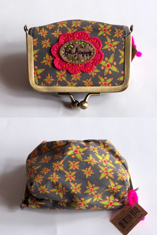 色は、パープルレッドとグレーの2色です。花柄にLOVE とbe happy のモチーフのワッペンが付いてます。