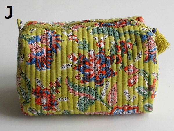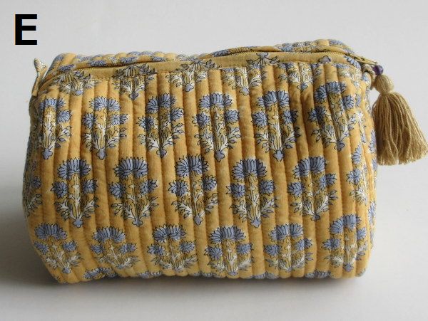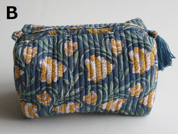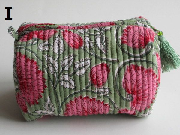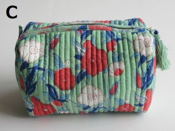 そのブロックプリントの手作りキルティングを使ったLサイズの大きめポーチです。ジップ式で口が大きく開き、マチも広いので、化粧品や旅行の際の小物類など、なんでも入れてお使い頂けます。布製のため簡単に小さくおりたためます。大きいガジェットポーチとして旅行のお供にも!